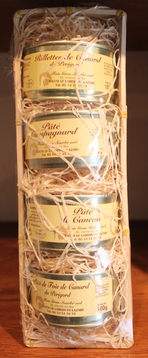 1 terrine de canard aux cèpes130g,1 terrine de canard aux chataignes130g,1 terrine du sud130g,1 paté campagnard130g