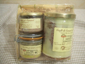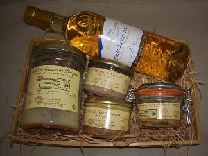 1 foie gras de canard 180g,1 paté de foie de canard 180g,1 rillettes de canard 130g,1 bouteille de vin moelleux 75cl